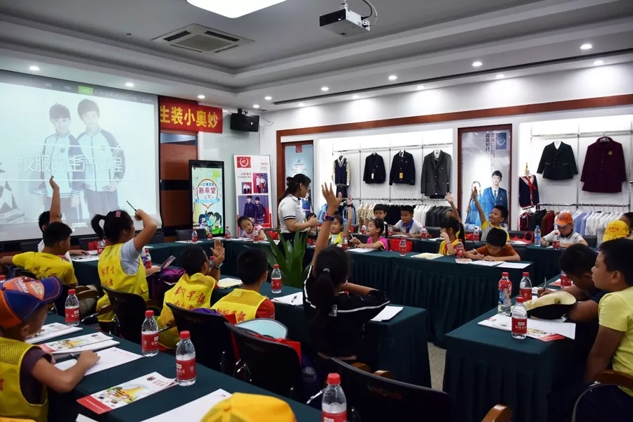 隨后,小記者們來到新希望學(xué)生裝生產(chǎn)企業(yè)百裕集團(tuán)營(yíng)銷中心,齊聚服裝展示廳共同深入探討學(xué)生裝知識(shí)。會(huì)上,小記者們共同觀看了“學(xué)生裝生產(chǎn)流程視頻”,并回顧往年“新希望”學(xué)生裝款式等內(nèi)容。