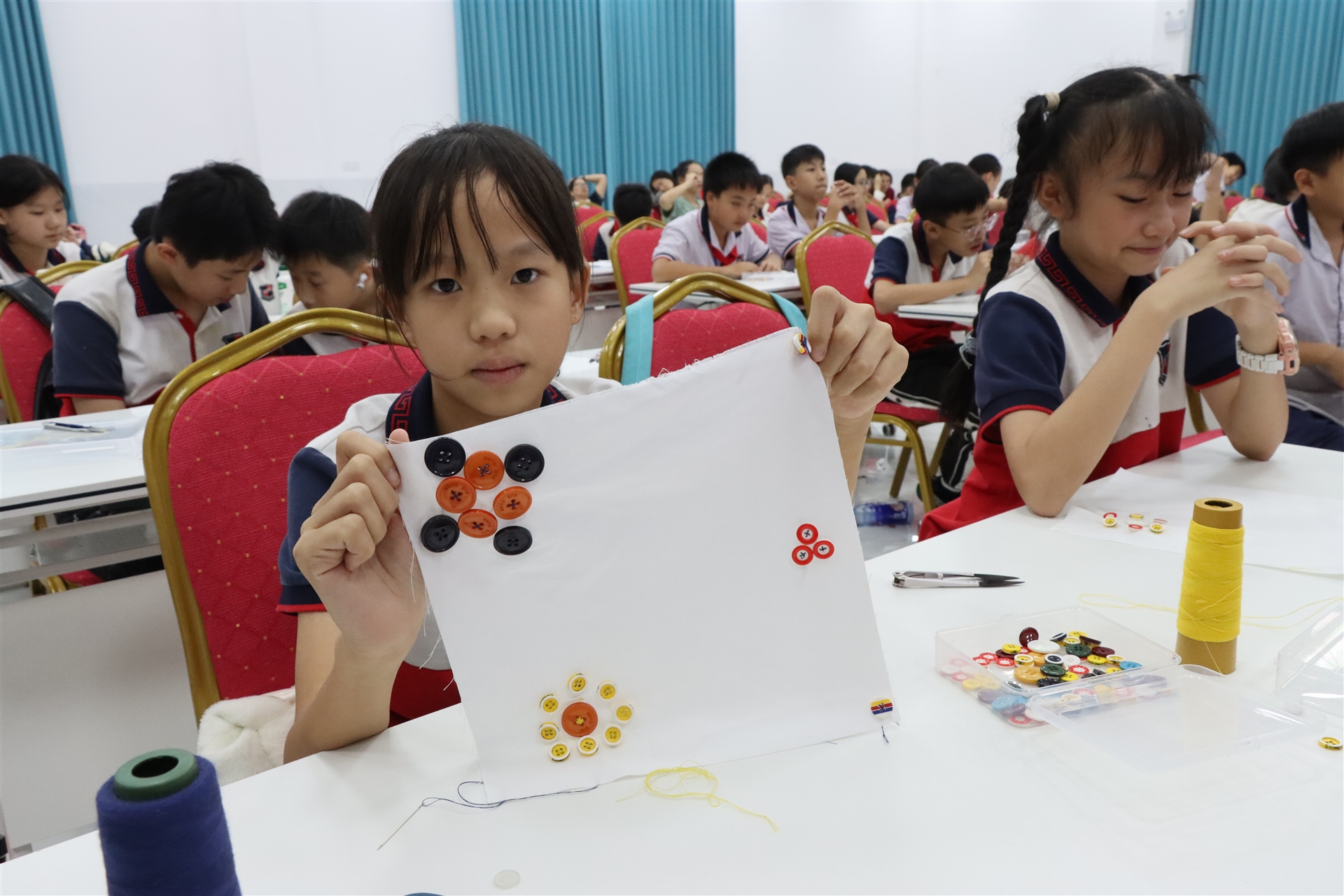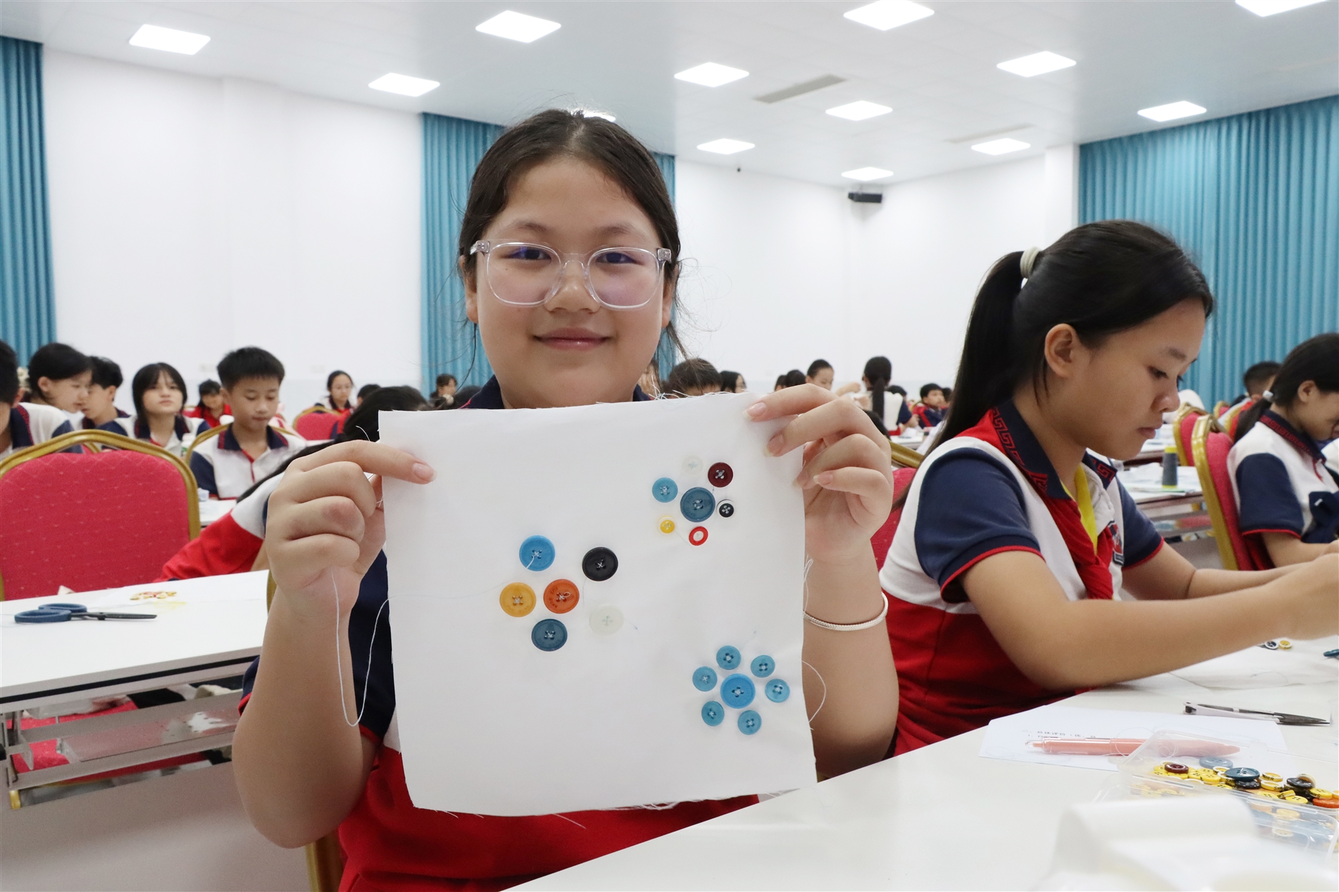 孩子們還體驗(yàn)了一場別開生面的服飾小制作,領(lǐng)略了制作之美。在老師的指導(dǎo)下,學(xué)生們首先了解紐扣的基本構(gòu)造和縫制紐扣的步驟要領(lǐng),之后再自己動(dòng)手做“針線活”,用略顯稚嫩的小手把扣子穿牢固定,還發(fā)揮了自己的想象力,把不同的扣子組合拼接,形成一幅幅生動(dòng)的花朵“畫作”。