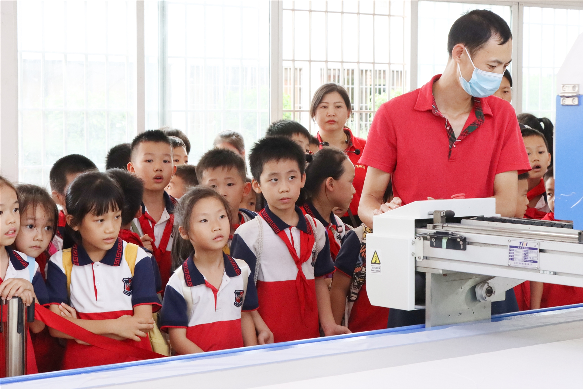 在講解員的引導(dǎo)下,孩子們走進(jìn)校服展示廳,了解校服的產(chǎn)生和歷史變遷,還參觀了解了校服的服飾面料、款式、紋樣以及背后蘊(yùn)藏的服飾文化。通過近距離觀察不同民族的服飾和傳統(tǒng)老式縫紉機(jī)、織布機(jī),他們不僅感受到了校服文化在歷史長河中的變遷及其魅力,也增強(qiáng)了學(xué)生的校服文化自信。