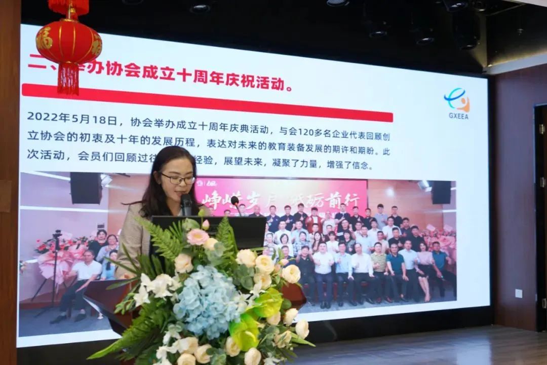 張珊會(huì)長對(duì)協(xié)會(huì)2022年工作情況進(jìn)行了總結(jié)匯報(bào)。2022年協(xié)會(huì)密切關(guān)注國家大事,堅(jiān)定不移與黨中央保持高度一致,組織協(xié)會(huì)會(huì)員企業(yè)集中學(xué)習(xí)黨的二十會(huì)議精神。在新冠疫情的大環(huán)境下,舉辦協(xié)會(huì)成立十周年慶典活動(dòng),成功舉辦第11屆廣西教育裝備展示會(huì),成立協(xié)會(huì)專家組,與廣西標(biāo)準(zhǔn)化協(xié)會(huì)簽訂發(fā)展戰(zhàn)略合作協(xié)議,同時(shí)積極吸收優(yōu)質(zhì)會(huì)員企業(yè),開展各種研討培訓(xùn)、展示交流、參觀考察、公益捐贈(zèng)等活動(dòng),在會(huì)員的共同努力下,向行業(yè)向企業(yè)交出了一份滿意的答卷。