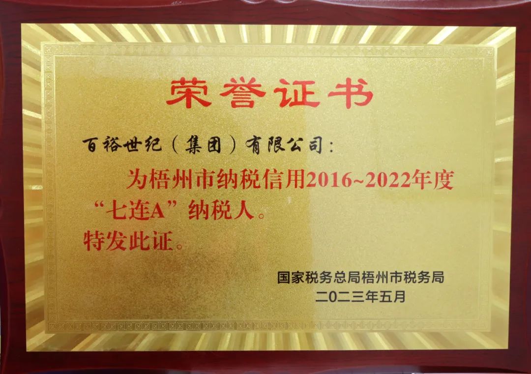近日,經(jīng)國家稅務(wù)總局梧州市稅務(wù)局評審,百裕世紀(jì)(集團(tuán))有限公司被評為2016~2022年度“七連A”納稅人,這是我們堅持依法、誠信經(jīng)營的實(shí)質(zhì)成果。