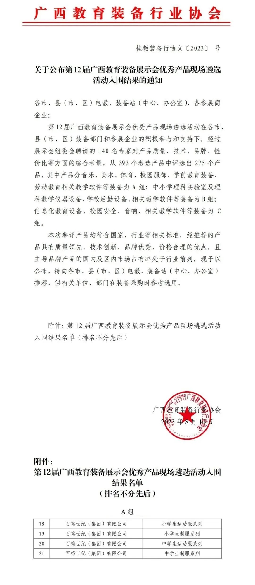 百裕世紀(jì)(集團(tuán))有限公司的4個校園服飾作品成功入選第12屆廣西教育裝備展示會優(yōu)秀產(chǎn)品推薦目錄,分別是小學(xué)生運(yùn)動服系列、小學(xué)生制服系列、中學(xué)生運(yùn)動服系列、中學(xué)生制服系列。