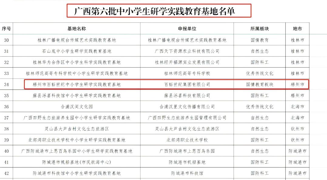 根據(jù)《自治區(qū)教育廳關于開展2024年全區(qū)中小學生研學實踐教育系列評選活動的通知》(桂教基教〔2024〕13號)要求,自治區(qū)教育廳組織各地開展廣西第六批中小學生研學實踐教育基(營)地和2024年中小學生研學實踐教育精品課程(線路)申報推薦工作。百裕世紀(集團)有限公司入選廣西第六批中小學生研學實踐教育基地名單。