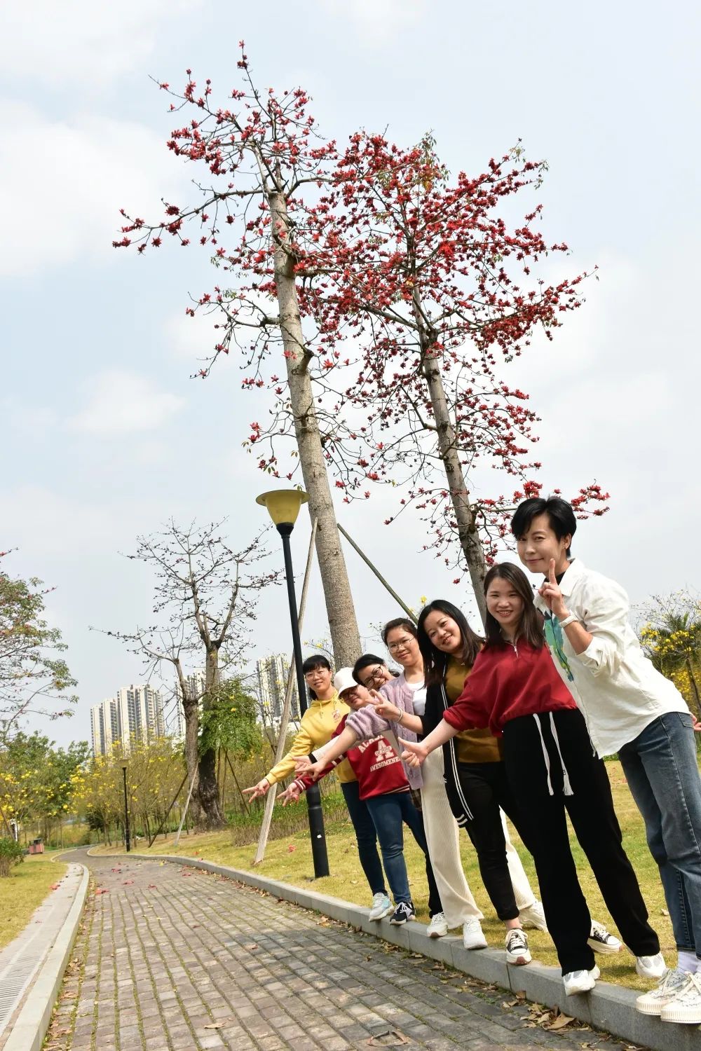 江南公園里黃風(fēng)鈴花金黃一片,靈動(dòng)美麗!桃花嬌艷欲滴、木棉花不像一般花草必須貼近才可欣賞,聳立在高枝上的她,不論遠(yuǎn)近,望過(guò)去,都是一副美麗的景象。