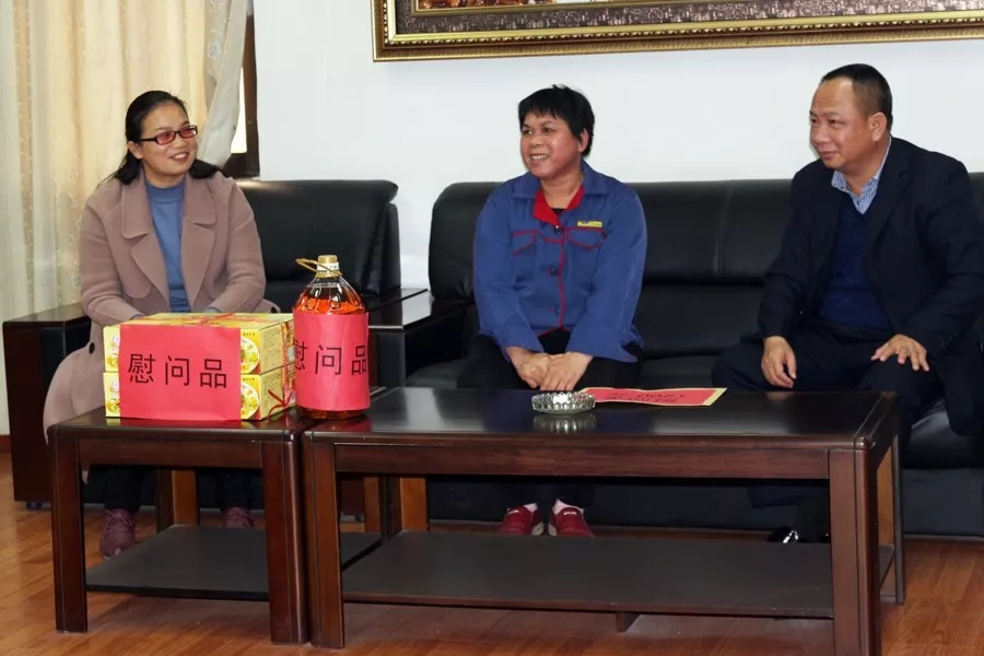 企業(yè)的發(fā)展離不開基層職工的辛勤付出,同月29日,廣西梧州市百裕實(shí)業(yè)有限公司常務(wù)副總經(jīng)理謝移植、岑溪生產(chǎn)廠廠長(zhǎng)王平志一行先后走訪黃旭群等困難職工,為職工們送去春節(jié)禮品,并轉(zhuǎn)達(dá)了公司對(duì)職工的深切問(wèn)候和美好祝福。